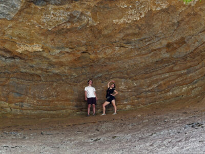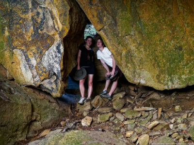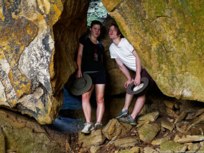 Amelia and Anton avoiding wet feet in the canyon whilst Jane hides behind a Fern.